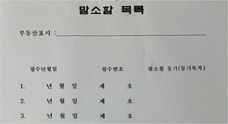 - 말소 대상 등기: 접수년월일, 접수번호, 말소할 등기(등기목적), 부동산(여러 개의 부동산인 경우, 구분할 수 있도록 지번/형태 기재)을 기재